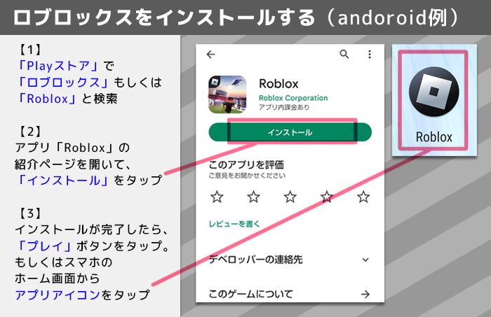 Androidスマートフォンを使った場合の方法を紹介します。 パソコン(PC)でRoblox(ロブロックス)を始めたい方は【こちらをクリックするとパソコンの説明まで飛べます】   ここでiPhoneなどのiOSスマートフォンと異なる点は、Roblox(ロブロックス)のアプリをインストールする際に利用するサービスが「Playストア」か「App store」か、という2点です。     スマートフォンで「Playストア」(iosの場合はApp store)を開き、「Roblox」もしくは「ロブロックス」と検索します。該当アプリを見つけたら「インストール」をタップ。 インストールが終わるまで数分かかります。しばらく待ちましょう。   インストールが完了したら、ページ上にある「プレイ」ボタンか、スマートフォンのホーム画面にできた「Roblox」アプリアイコンをタップします。