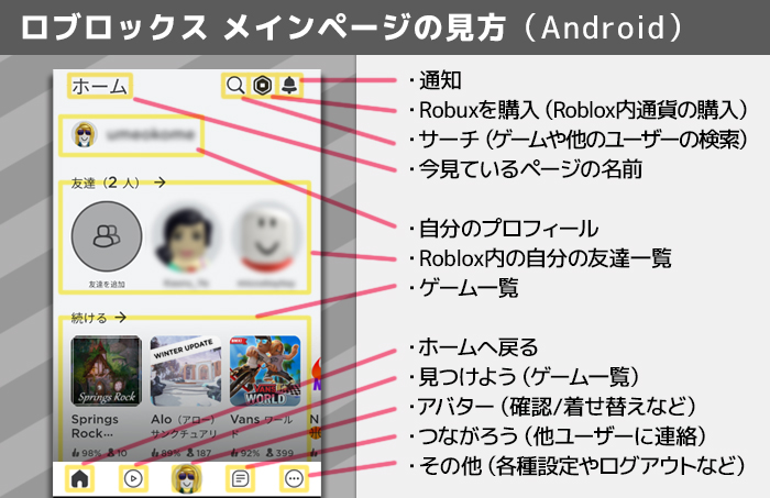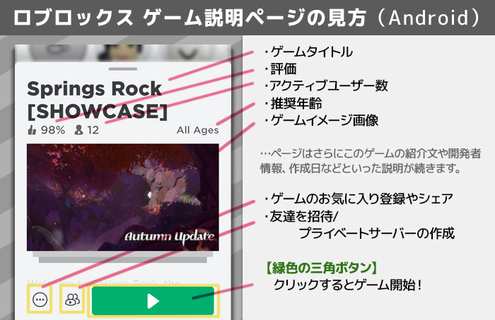 これでスマートフォンでRoblox内のゲームをプレイできるようになりました。 新規登録・ログインすると、以下のページが表示されるようになります。     メインページである「ホーム」画面。もしくは「見つけよう」(画面下部の左から二番目のアイコン)から、ゲーム一覧が見られます。ここから遊んでみたいゲーム作品を探しましょう。 サーチボックスを活用して、作品タイトルやキーワードで検索することもできます。   遊びたいゲームを見つけたらタップします。 ゲーム概要ページ下部にある「緑色の三角ボタン▶」をクリックすると、ワールドへの移動が始まります。ゲーム開始です。   ※ゲーム:Springs Rock [SHOWCASE] https://www.roblox.com/games/2594417690/Springs-Rock-SHOWCASE