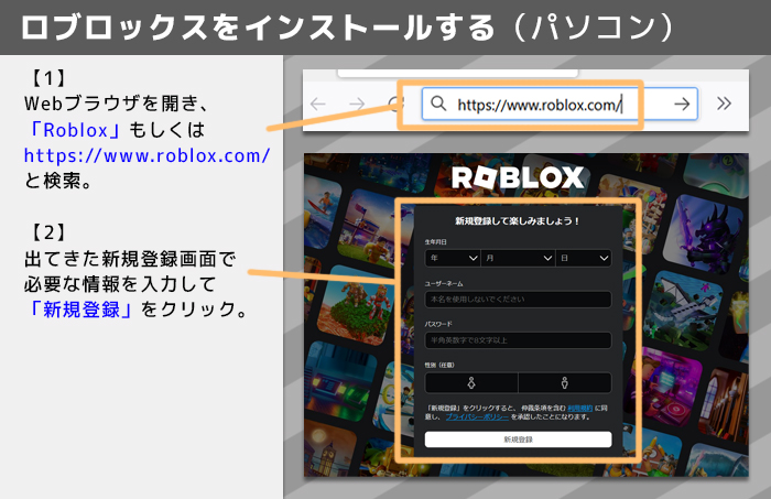 【大まかな手順】 ■スマートフォン(iOS) 「Play ストア」で「Roblox」と検索→インストール→新規登録 ■スマートフォン(Android) 「App store」で「Roblox」と検索→インストール→新規登録 ■パソコン(Windows) Webブラウザで「Roblox」もしくは「https://www.roblox.com/」と検索→新規登録→インストール