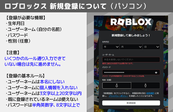 スマホ版同様に、いくつかのルールを守って入力しないと先に進めません。 たとえば、ユーザーネームに個人情報を入れないどの項目も入力は半角英数字で。 文字数は、下限・上限内に留まるものに決める……など、さまざまな条件があります。   ここで決めたユーザーネームとパスワードは、今後Roblox(ロブロックス)にログインする際に必要な情報です。忘れないように注意してください。登録したパスワードは他人に教えてはいけません。     ※「ユーザーネーム」登録後の変更は有料です。のちのち後悔しないものをつけましょう。 ※13歳未満で登録した場合、生年月日の変更はできません。 ※不適切なコンテンツと個人情報の投稿を防ぐため、13歳未満のユーザーはゲームとチャットに規制がかかります。   上の項目から順番に入力しないとエラーが表示されますが、最終的にすべての必須項目を埋めてしまえば特に問題ありません。 入力したら「新規登録」ボタンをタップして登録完了です。