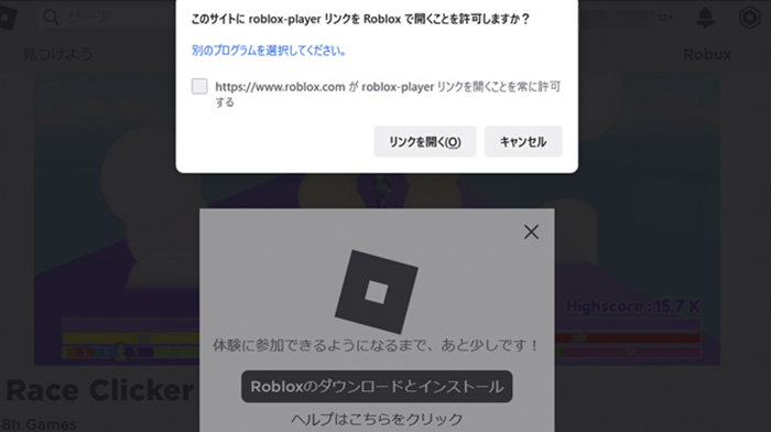 スマートフォン版と違い、ここからさらにインストール作業へと移ります。 パソコン(PC)でプレイする場合、初回はRoblox(ロブロックス)インストーラをダウンロードしなければなりません。   「新規登録」完了後に表示されたWebページから、なんでもいいのでゲームを選びます。 Roblox(ロブロックス)公式サイト中央に表示されているすべてがゲームです。   Roblox(ロブロックス)公式サイト。ログイン後のトップページ画面 好きなゲームを選んで、ゲーム概要ページへと飛んだら、「緑色の三角ボタン▶」をクリック。すると画面全体が薄暗くなり「Robloxのダウンロードとインストール」という案内が表示されるので、さらにクリックします。     パソコンの設定によっては「このサイト(※Roblox公式サイト)にroblox-playerリンクをRobloxで開くことを許可しますか?」というように、サイトの権限について確認が表示される場合があります。「リンクを開く」をクリックしましょう。     緑色の三角ボタン▶をクリックして、画面上に上の画像の案内が表示されたら、「Robloxのダウンロードとインストール」ボタンをクリック。     ダウンロード完了までの手順が表示されます。親切。 この表示内容に沿って、一通り操作をすれば、Robloxインストーラーのダウンロードが完了です。     一度インストールしてしまえば以降は自動的にゲームが起動します。 これでパソコン(PC)でRoblox(ロブロックス)のゲームを始める準備ができました!