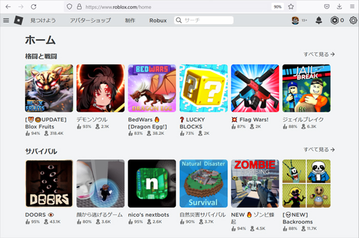 これでパソコン(PC)でRoblox(ロブロックス)内のゲームをプレイできるようになりました。次はゲームの始め方です。 ゲーム一覧から、プレイしたい作品を選びましょう。ヘッダーの「見つけよう」や「サーチ」から、好みのゲーム作品を探すこともできます。   選んだゲームの概要ページへと飛んだら、再度緑色の三角▶ボタンをクリック。 するとローディングが始まり、別窓でゲームが立ち上がります。