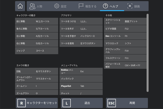 その他、ゲームによって独自の操作が入る場合があります。     ゲーム中の操作を確認するには、ゲーム内で「Escキー」をプッシュ。もしくは画面左上のロブロックスマークをクリック。表示されたページ内で「ヘルプ」をクリックすれば確認が可能です。   このページでは操作方法の確認だけでなく、ゲームの退出や同じワールド内にいるユーザーの確認、カメラや音量の設定、規則違反者の報告などもできます。必要に応じて使ってみましょう。