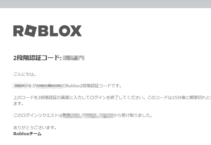 この設定を有効にするために必要なものは、ログイン時にも必要なパスワードの入力のみです。   この2段階認証を有効化すると、以降のRoblox(ロブロックス)へのログイン時に、ユーザー名とパスワードだけでなく、認証コードの入力も要求されるようになります。   認証コードは、ログイン時に登録済みのアドレスへ自動で送信されます。     Roblox(ロブロックス)から届く認証コードのメール(一部)。認証コードはログイン毎に変わります